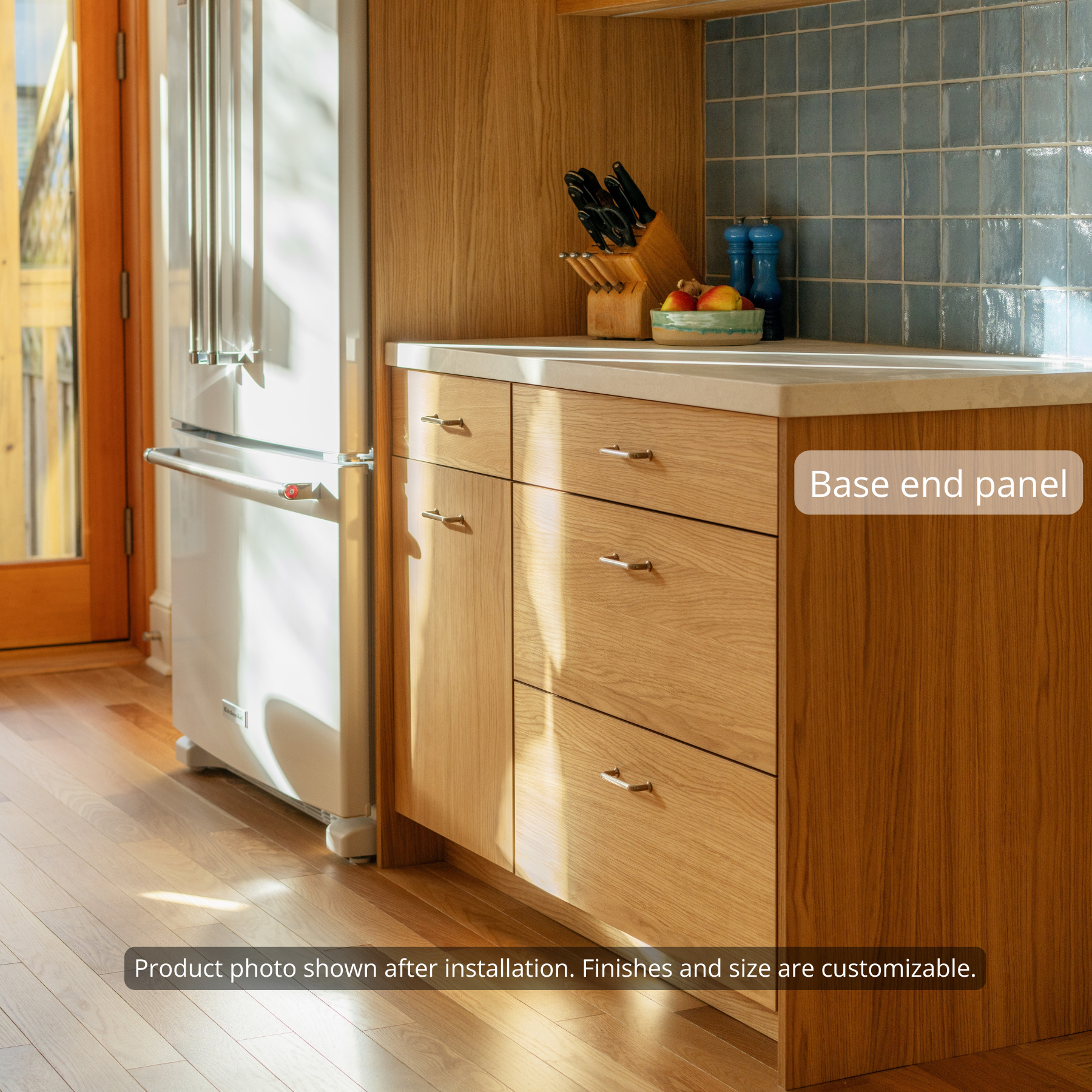 Finished flat/slab panel that is sized to conceal the exposed side of a base cabinet (e.g. at the end of a cabinet run).