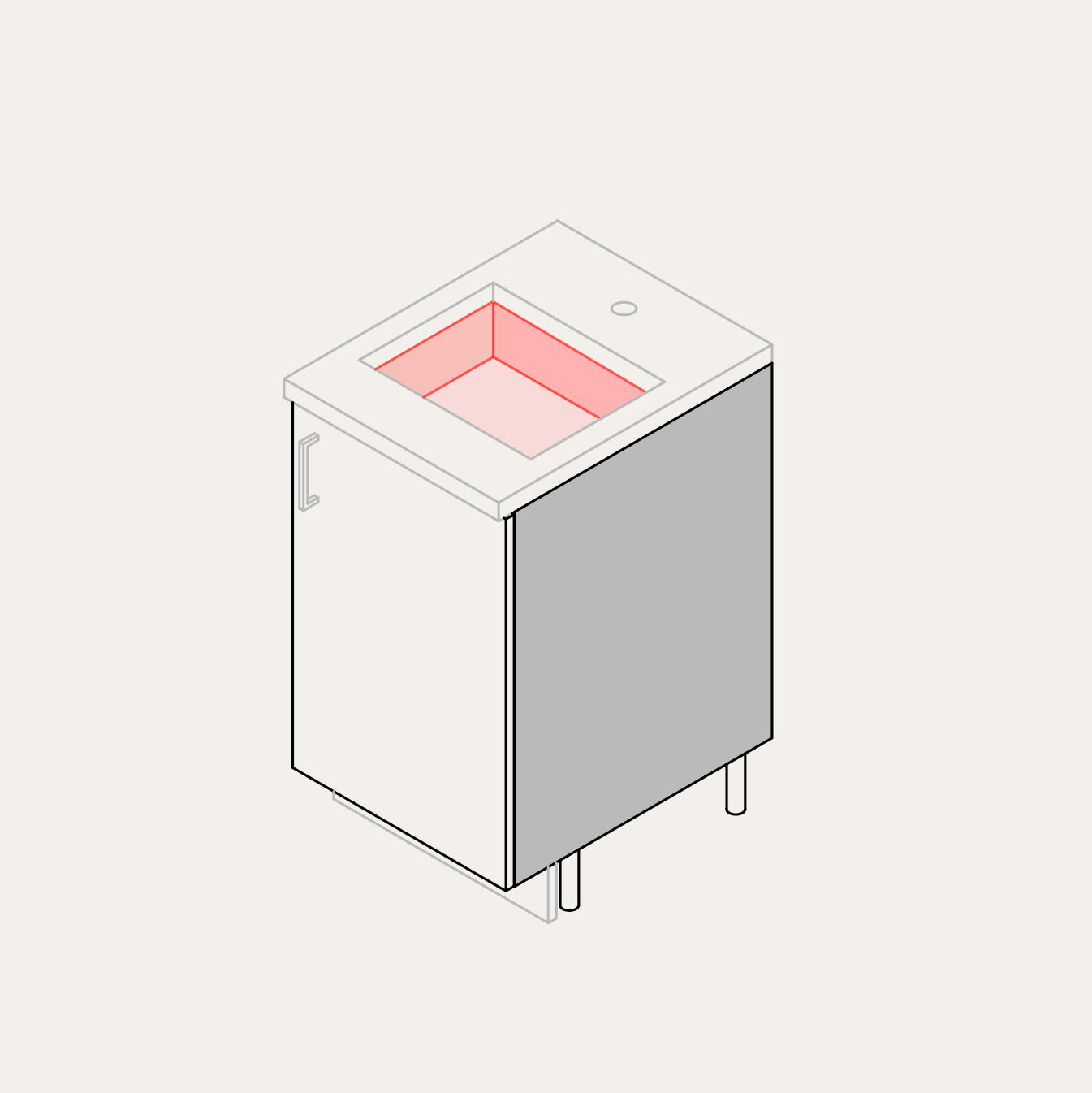 Vanity cabinet with 1 full height door that can accommodate a vanity sink. Hinges are on the right side of the door.